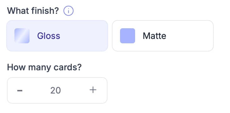 After you've unleashed your creativity and designed your bingo card, it's time for the finishing touches. Dive into our options for card stock, size, and finish to make your cards truly shine. Each choice ensures your cards will look and feel top-notch!
