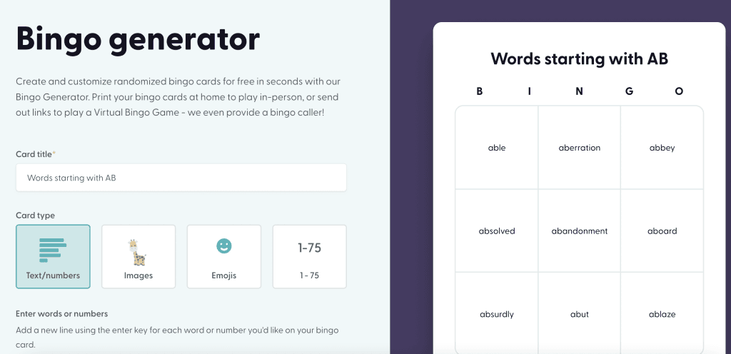 We've introduced a new way to randomize cards. By default, we'll shuffle your entire card, but you can also enable traditional randomization, which will shuffle your cards like a 30, 75, or 80-ball game of bingo. Reorder your images and word list to pick which column you want them to show in.