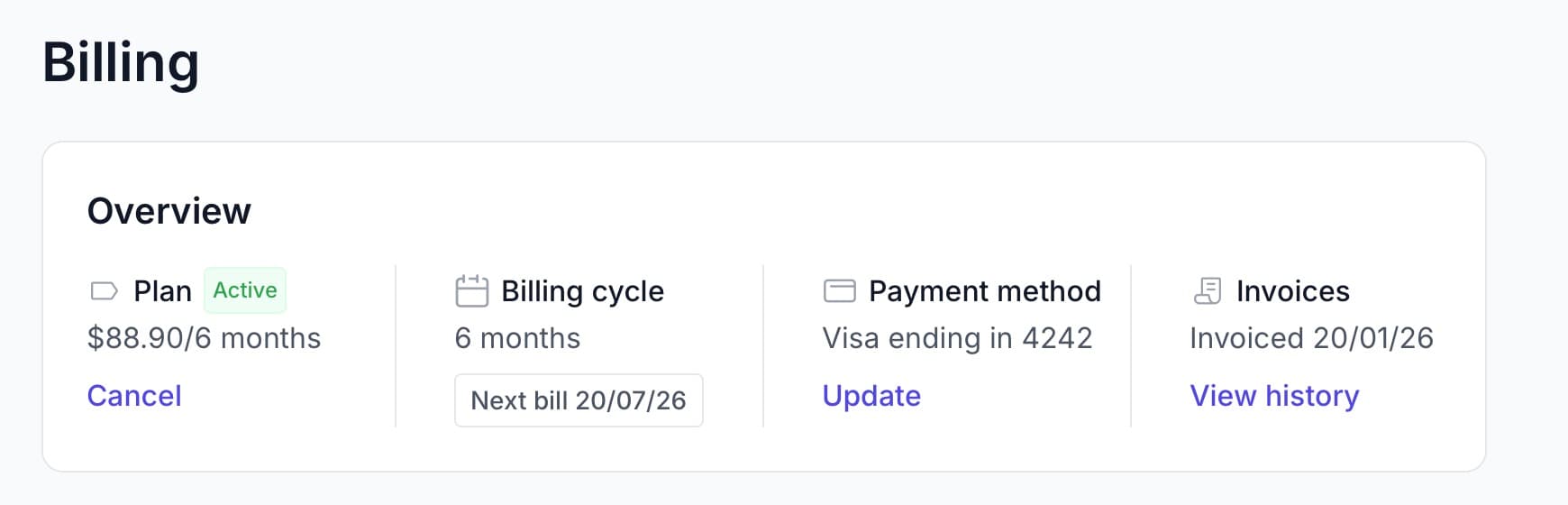 1. On the billing page, you have the ability to manage your payment methods, view invoices, change your plan, or cancel your subscription.